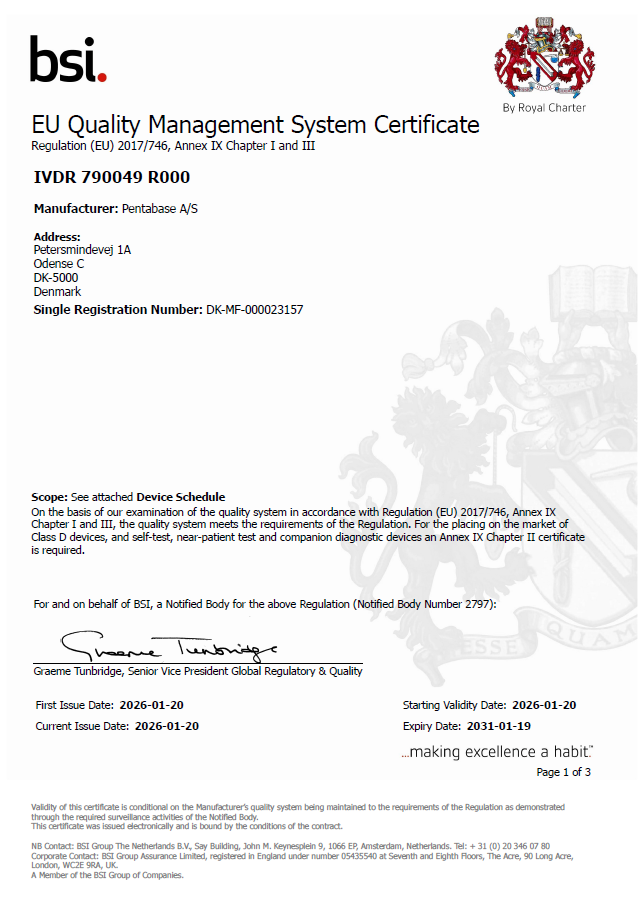 PentaBase A/S is proud to hold an EU Quality Management System Certificate under Regulation (EU) 2017/746 (IVDR) (Certificate No. IVDR 790049 R000), issued by BSI Group (Notified Body 2797).