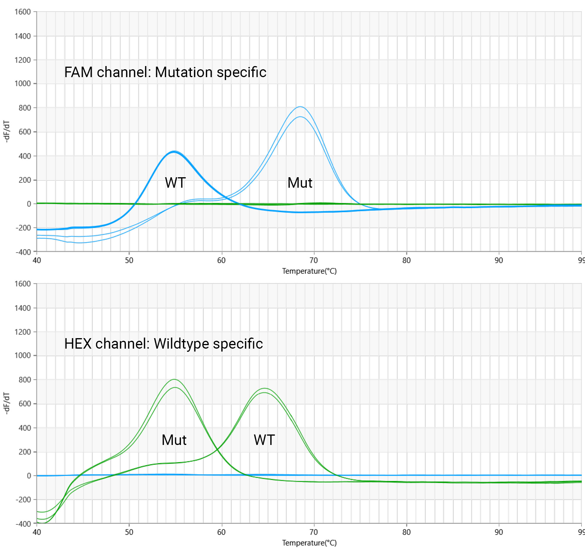 By incorporating INA®-based EasyBeacon probes we can design assays with very high target specificity. Assay performance is evaluated using wildtype (WT) and mutated (Mut) templates in melt-based studies as part of the verification process.